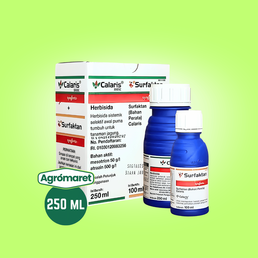 CALARIS 550 SC adalah herbisida pra-tumbuh dan purna-tumbuh awal dengan kombinasi dua bahan aktif, Mesotrione 50 g/l dan Atrazine 500 g/l, yang bekerja secara sistemik dan kontak untuk mengendalikan gulma daun lebar dan beberapa jenis rumput pada tanaman jagung. Formulasi SC (Suspension Concentrate) membuat produk mudah larut, stabil, dan efektif menempel pada permukaan gulma.
