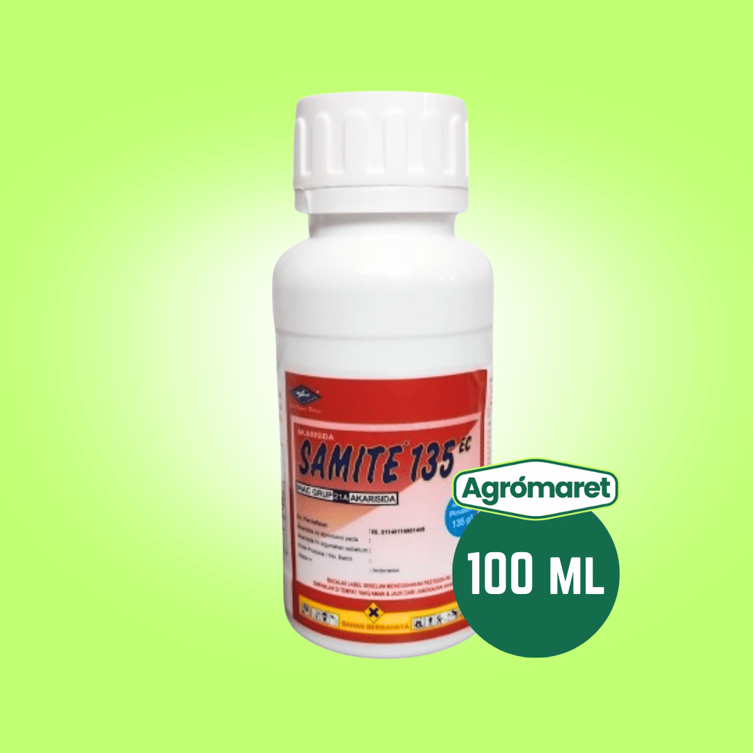 SAMITE 135 EC Adalah akarisida (racun tungau) racun kontak berbentuk pekatan yang dapat diemulsikan berwarna kemerahan. Produk unggulan dari Cap Kapal Terbang ini dirancang khusus untuk mengendalikan hama Tungau (Mites) pada tanaman Cabai, Jeruk, Apel, dan Teh.